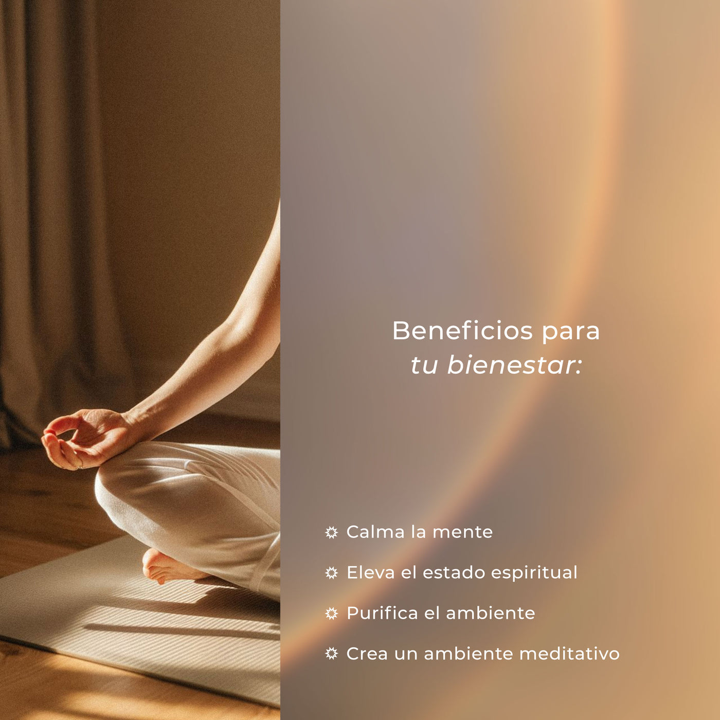 Difusor: Agrega de 3 a 5 gotas en tu difusor favorito para llenar el espacio con un aroma profundo y espiritual, ideal para momentos de meditación y relajación.