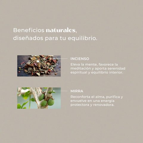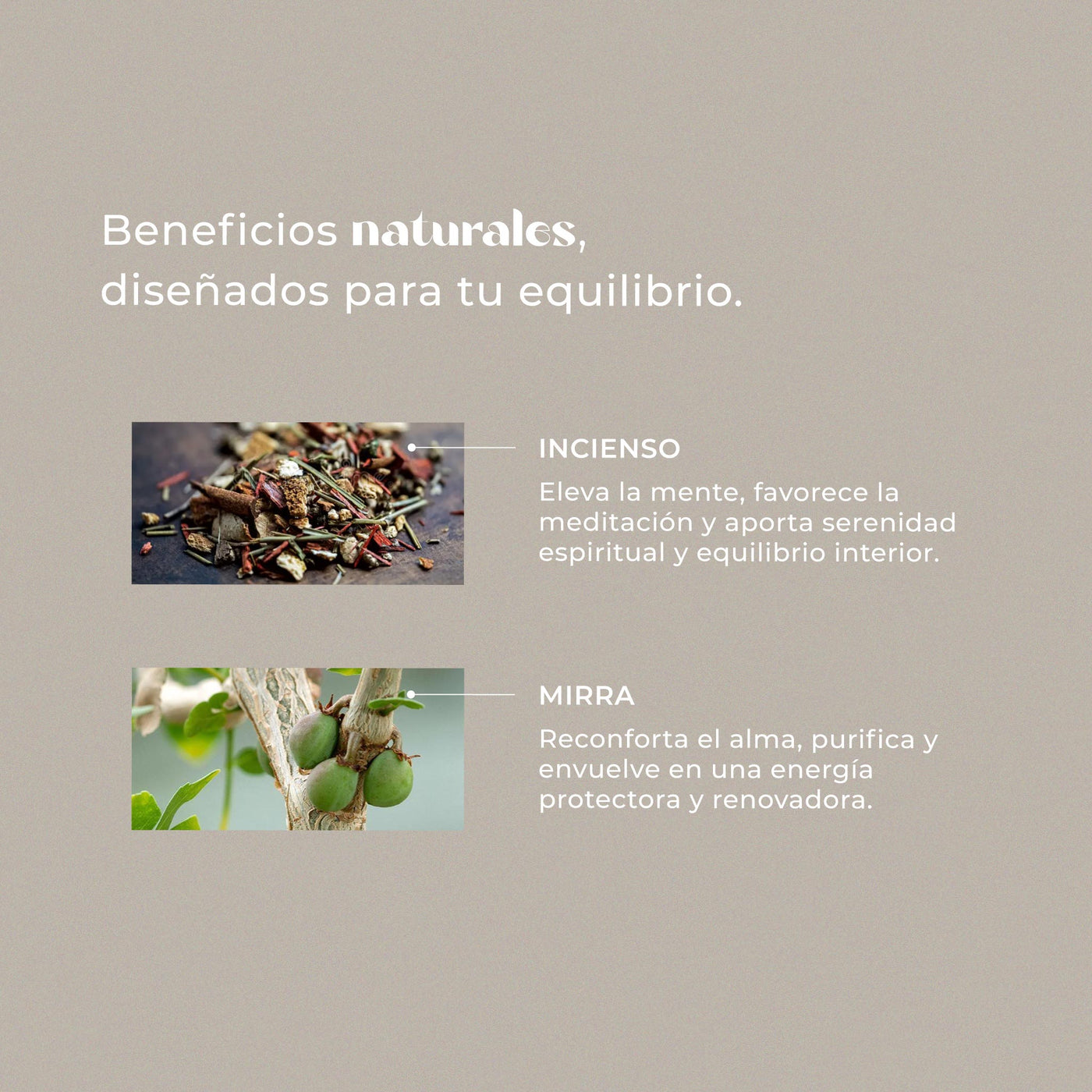 Ambiente de Paz y Espiritualidad: La combinación de incienso y mirra crea un aroma profundo y místico que ayuda a promover un ambiente de introspección, ideal para la meditación y la conexión espiritual.