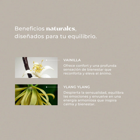 Relajación y Reducción del Estrés: Ylang ylang es conocido por sus propiedades relajantes que ayudan a reducir la ansiedad, mientras que la vainilla añade una nota de confort y paz, ideal para aliviar el estrés.