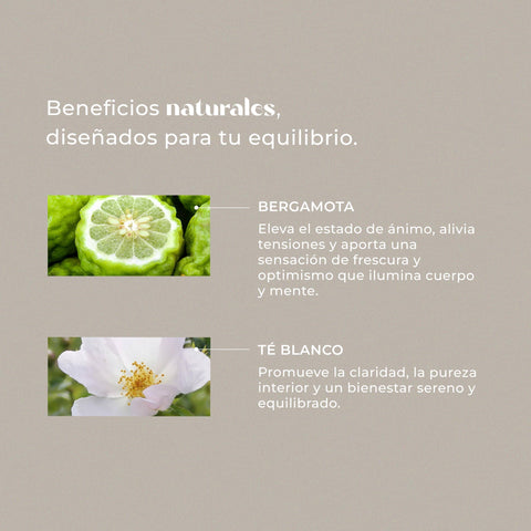 Ambiente Refrescante: La bergamota y el té blanco juntos brindan un aroma fresco y ligero, ideal para cualquier momento del día y especialmente útil en espacios de trabajo o estudio.
