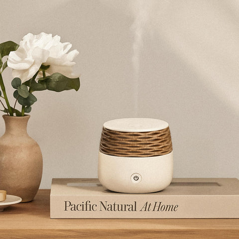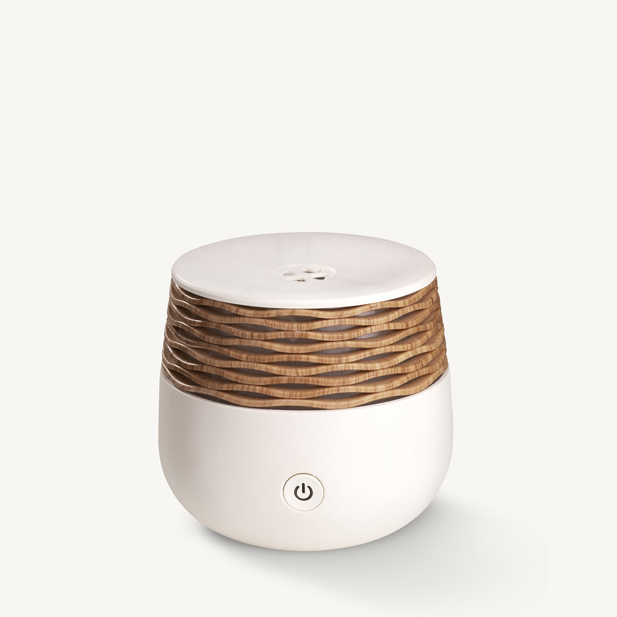 4.Coloca la cubierta superior, presiona el botón Power al escuchar un click el difusor se encenderá y comenzará a vaporizar. Cuando el difusor esté en funcionamiento y detecte escasez de agua, se apagará automáticamente previniendo quemaduras y fallas en el difusor y sus partes internas.
