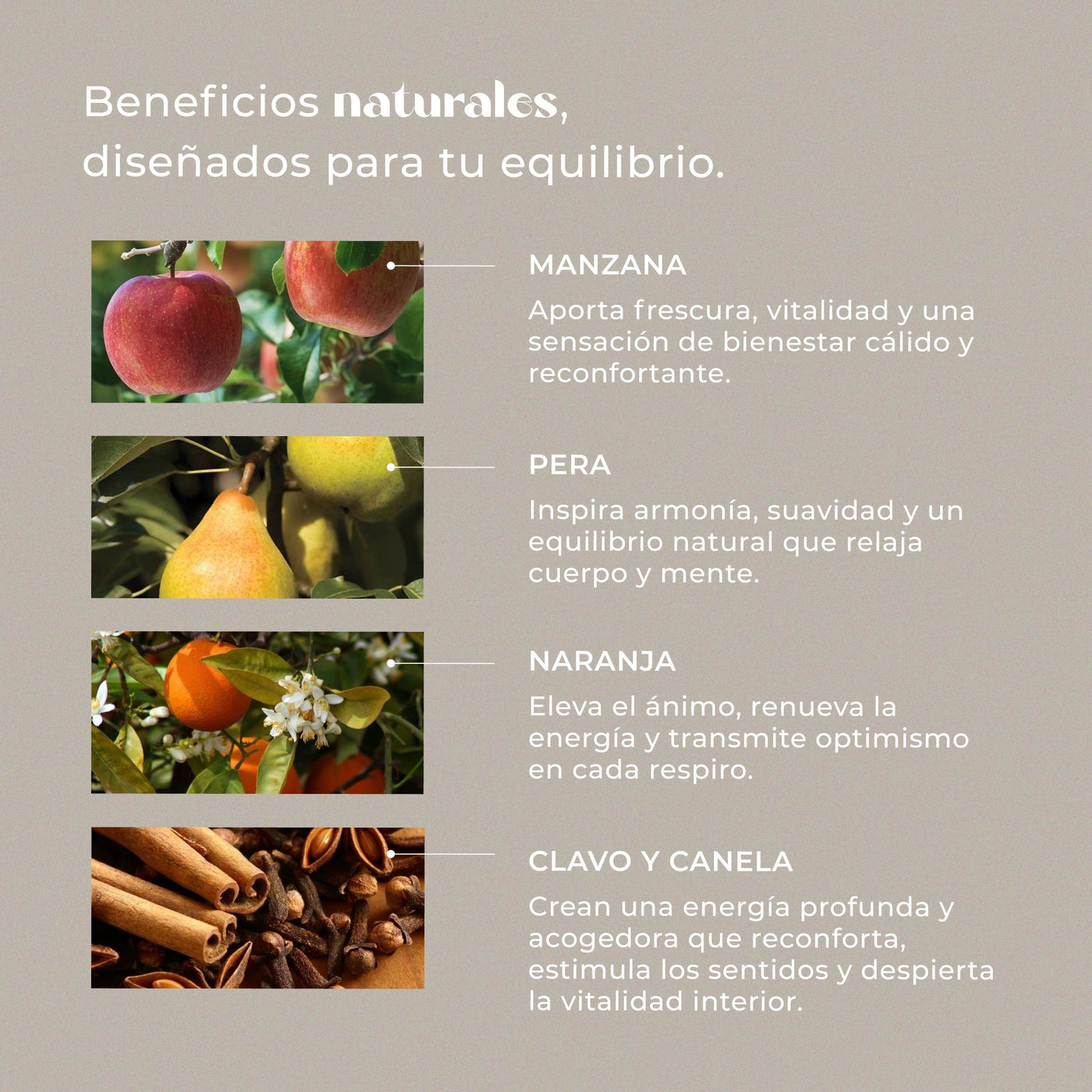 Nuestro aceite esencial combina el dulce aroma de la manzana y la pera, la chispa cítrica de la naranja, y las notas especiadas del clavo y la canela, creando un ambiente acogedor que evoca recuerdos de hogar, risas y momentos compartidos. Déjate llevar por el espíritu navideño y llena tu espacio con esta fragancia encantadora. ¡Porque cada día puede oler a Navidad!